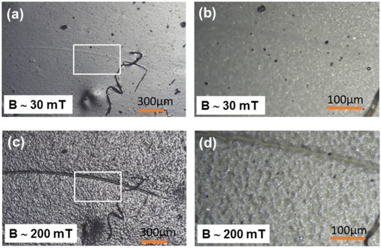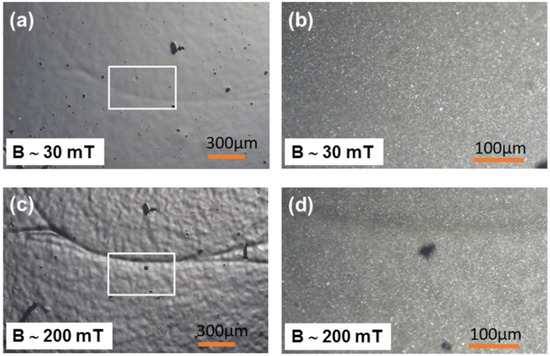 Optical microscopy images of the surface topography of soft MAE with a 70 wt% CIP: (a) B = 30 mT, magnification 5×, (b) B = 30 mT, magnification 20×, (c) B = 200 mT, magnification 5×, and (d) B = 200 mT, magnification 20×.
