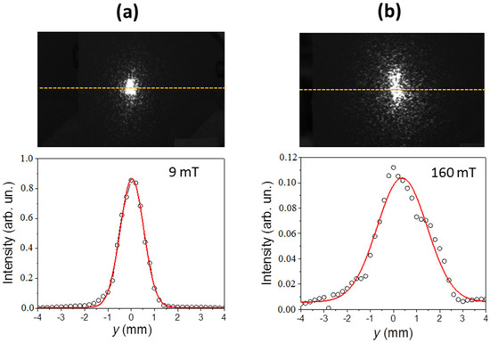 The lower images in Figure 4 show the spatial dependencies of the reflected intensity Ir(y) measured by translating the photodiode along the yellow lines in the upper images. As already mentioned, these dependencies are averaged over the speckle pattern. The red lines are fits to the Gaussian profile. Also, here, one can notice that the width of the profile obtained in the higher field is considerably larger. In addition, if comparing the values on the vertical axes, it can be noticed that the line-integrated intensity of the reflected light I0 = ∫Ir(y)dy for the higher magnetic field is considerably lower than expected for the associated broadening. This suggests that the total optical power reflected from the sample decreases with an increasing field.