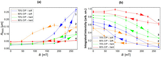 Field dependences of (a) the RMS roughness and (b) the integrated intensity for four different MAE materials: (blue, 1) soft MAE with a 70 wt% of CIP, (yellow, 2) soft MAE with an 80 wt% of CIP, (green, 3) hard MAE with a 70 wt% of CIP, and (red, 4) hard MAE with an 80 wt% of CIP. The dashed lines are guides to the eye. The arrows pointing to the right indicate data obtained during an increasing magnetic field, and the arrows pointing to the left are data obtained during a decreasing magnetic field.