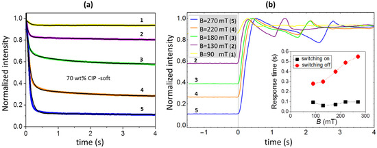 The time dependencies of the normalized reflected intensity detected after switching the magnetic field of various magnitude either (a) on or (b) off: Yellow (1) B = 90 mT, purple (2) B = 130 mT, green (3) B = 180 mT, orange (4) B = 220 mT and blue (5) B = 270 mT. The black lines in Figure 8a show exponential fits. The inset in Figure 8b shows the obtained response times as a function of the magnetic field. All data are given for the soft MAE with a 70 wt% of CIP.