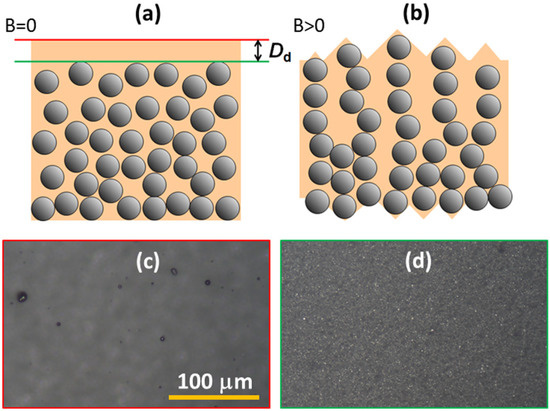 In the absence of a magnetic field, all MAE composites investigated in our study exhibit an RMS roughness below 50 nm, which is very much below the microparticle size (diameter of 4.5 μm). Such a low surface roughness is explained by the existence of a topmost polymeric surface layer that is depleted of microparticles, as depicted in Figure 9a. This layer is most probably formed during the degassing phase of the liquid prepolymer mixture, as a consequence of surface tension and gravitational sedimentation. The sedimentation of microparticles is a known challenge in magnetorheological fluids [52]. In MAEs, this sedimentation is prevented after curing, and it is difficult to observe it directly in such thin samples. Previous X-ray micro-computed tomography measurements on nominally isotropic MAE samples also indicated a homogeneous particle number density within the sample with strong deviations at top and down surfaces [53].