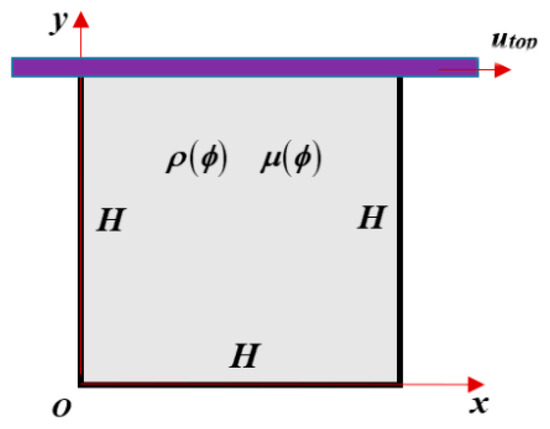 To test the governing equations and the numerical methods, a numerical case is designed for the DNS of the gas-liquid drag-reducing flow, as shown in Figure 1. Some literature showed that the lid-driven cavity case can be used for drag-reducing flow of nanofluid [50], two-phase flow with nanofluid [51,52], and mixed convection of a non-Newtonian fluid [53]. Thus, it is appropriate for two-phase drag-reducing flow induced by non-Newtonian polymer solution. The computational domain is a square cavity with the side length H and the moving wall velocity utop. H is set as 1 m with the mesh size 150 × 150. Other key parameters are set as: λ = 0.14 s, β = 0.8. The numerical test shows that the computation is restricted in a very narrow range (utop = 1 m/s~2 m/s). When the utop is larger than this range, the computation is broken up more quickly. This indicates that numerical stability is very weak in current numerical framework.