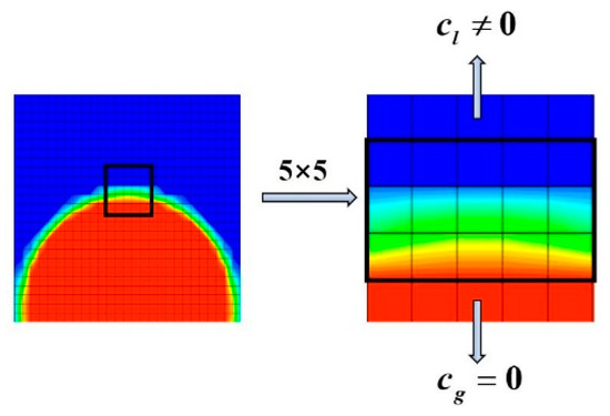 Gas volume fraction in Equation (8) is an important variable in the whole simulation. Direct computation of Equation (8) in an entirely traditional way may encounter strong numerical instability due to the lack of a diffusion term. The treatment is taking advantage of the two-phase interface. Details can be found in Sun’s paper [35]. Here, we explain the idea briefly in the form of our own case as follows.
