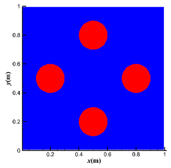 For lid-driven flow, it is difficult to define the drag reduction rate directly because it is hard to calculate the friction factor for this kind of rotational flow. Drag reduction can be represented not only by the reduction of the friction factor but also by the promotion of the bulk mean velocity. Thus, we used the increasing percentage of the bulk mean velocity with the addition of polymer under the same lid-driven velocity to measure the drag reduction quantitatively. Three lid-driven velocities (utop = 1, 10, 50 m·s−1) were examined. The initial phase distribution is shown in Figure 4, where the initial bubble diameter is 0.2 m.