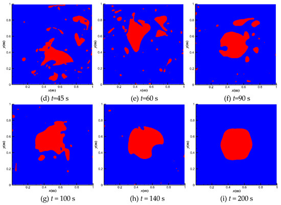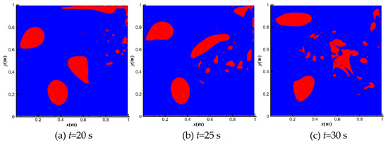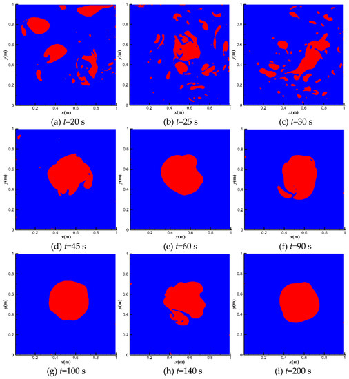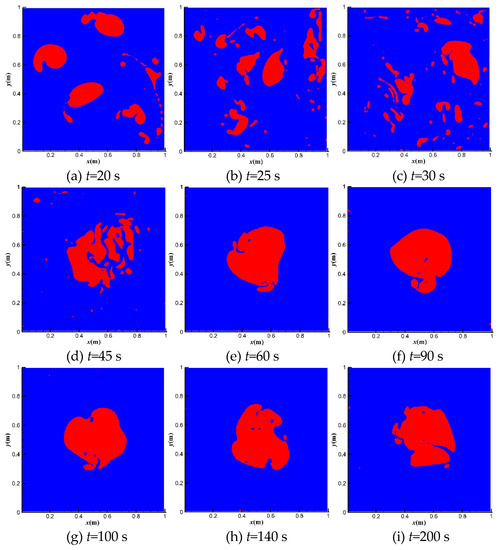 Figure 5 shows the bubble distributions at different moments at utop = 1 m·s−1. The red area is the gas phase, while the blue area is the liquid phase. The top right bubble breaks firstly due to its position in the high shear region. Other bubbles break quickly from 20 to 45 s. After 100 s, the scattered small bubbles merge into one large bubble in the center of the domain. The large bubble is quite stable due to its position in the low shear area.