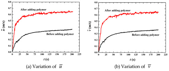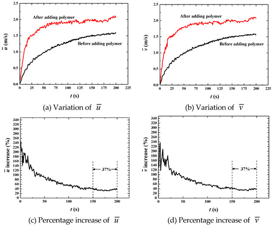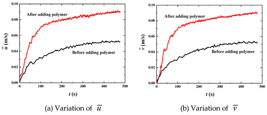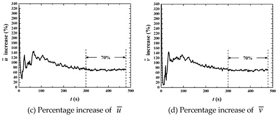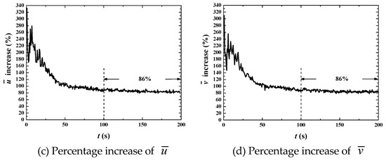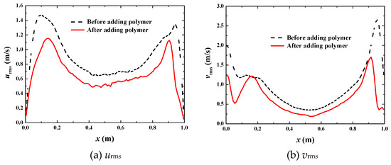 Figure 6 shows that the bulk mean velocity ( in the x direction and in the y direction) increases rapidly from the initial condition to about 300 s. After 300 s, the bulk mean velocity and its increasing percentage tend to stabilize, thus that fully developed flow is achieved in this time span (Figure 6a,b). Once we obtained the fully developed flow, some statistically stable parameters can be analyzed to reveal more essential mechanisms. The percentage increase of the bulk mean velocity for the fully developed flow is about 70% (Figure 6c,d), showing good drag reduction. Figure 7 shows that the Reynolds number decreases from about 10,000 to 4000, verifying that flows with or without polymer are both in the turbulent regime. The decrease of the Reynolds number in the situation of increasing mean velocity is due to the significant change of liquid viscosity. From Equation (11), it is easy to find that the dynamic viscosity of the polymer η is 4 times of the solvent viscosity μ, thus that the liquid viscosity μl becomes 5 times of μ (μl = μ + η). For the Newtonian flow without polymer, μl = μ. That means liquid viscosity after adding polymer is 5 times than that without polymer. Thus, Reynolds number decreases dramatically according to Equation (17), although the bulk mean velocity increases by 70% due to adding polymer. The decrease in Re indicates the change of turbulent fluctuation intensity. Therefore, the fluctuation intensity should be analyzed to further demonstrate drag reduction behavior.