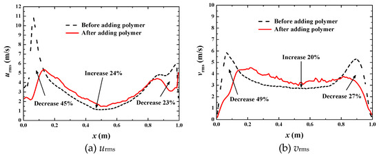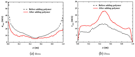 When utop reaches up to 50 m·s−1, the bubbles are always in dynamic motions with frequent breaking and merging (Figure 13) because turbulence is very active with the Reynolds number around 3 × 105 before adding polymer, and still as high as about 1 × 105 after adding polymer (Figure 14). The bulk mean velocities also increases after adding polymer (Figure 15a,b), indicating drag reduction is still valid at a high Reynolds number. However, the drag reduction efficiency is much lower than the previous two cases. The increase in the bulk mean velocity is only 37% (Figure 15c,d). With further analysis of the fluctuation intensities, we find a phenomenon that urms is decreased by about 32% but vrms is increased by about 62% (Figure 16). That means some of the fluctuations are not suppressed but enhanced. This is the reason for only a 37% increase in the bulk mean velocity.