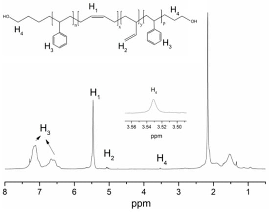 1H-NMR of HO–SBS–OH, initiator: St:B:St (molar ratio) = 0.02:1:4:1.