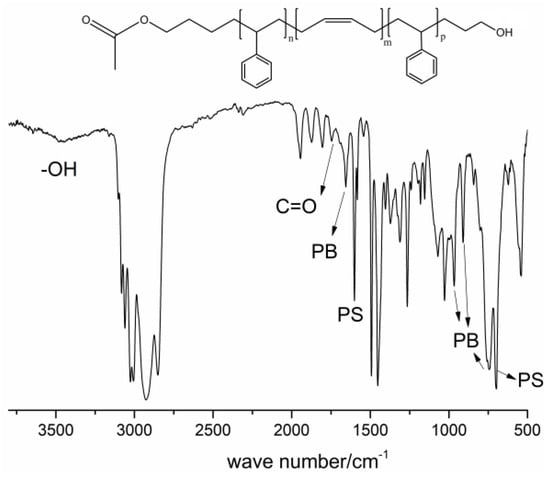 FT-IR of CH3COO–SBS–OH, initiator: St:B:St (molar ratio) = 0.02:1:4:1.