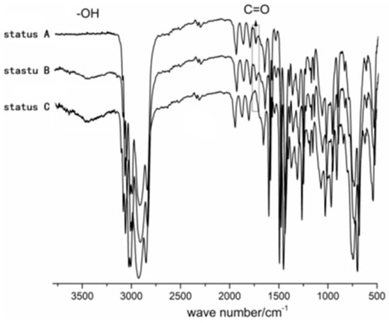 FT-IR data of three kinds of polymer statuses, status A = before adding iodopropanol, status B = after adding iodopropanol (before hydrolysis); status C = hydrolysis.