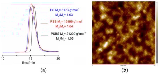 (a) The GPC data of polystyrene, polystyrene-b-polybutadiene and polystyrene-b-polybutadiene-b-polystyrene; (b) AFM data of HO–SBS–OH.