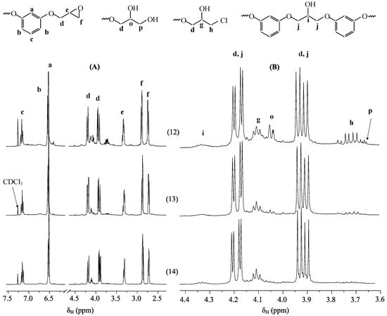 1H-NMR spectra PERO No. 12, 13 and 14 (Table 3) with the assignment of signals of protons of different groups (A) and an enlarged area with a chemical shift 3.6–4.4 ppm (B).