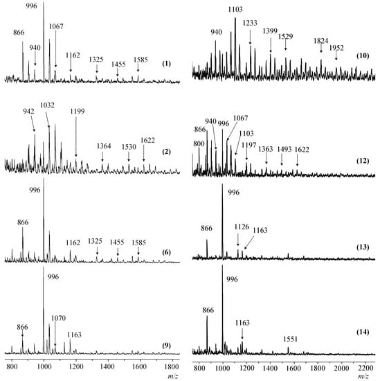 MALDI-TOF mass spectra of PERO synthesized at a molar ratio of HCP: resorcinol 1:16 (1, 6, 13), 1:12 (2, 12) and 1:24 (9, 14) at temperatures of 65 °C (1) and 116 °C (2–14), duration 90 min (1) and 30 min (2–14) and single-moment (1–9) and portioned (10–14) addition of NaOH. The numbers of the spectra correspond to the numbers of the samples according to the Table 2 and Table 3.