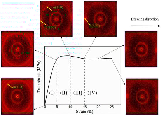 To further elucidate the microstructure evolution of the iPP sheets as a function of stretching strain, in situ two-dimensional wide-angle X-ray scattering (2D-WAXS) profiles during stretching at 3 mm·min−1 with 110 °C were recorded, and they are shown in Figure 3. The true stress-strain curve of the iPP sheets is also shown in Figure 3. When the stretching strain was less than 5% (I) prior to the yield point, a typical spherulite diffraction circular ring for α (110) was observed. When the stretching strain reached 10% (II) near the yield point, a weak diffraction arc for β (300) was observed along the stretching direction. Then, the diffraction arc for β (300) became more obvious as the stretching strain increased from 10–15% (III). which indicated that the content of cylindrites gradually increased. However, when the stretching strain increased from 15% to 25% (Ⅳ), the diffraction intensity of arc β (300) was not significantly enhanced, which implied that the content of cylindrites reached a maximum at a stretching strain of 15%.