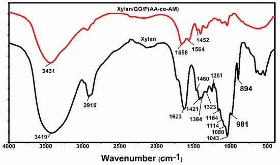 Figure 2 shows the FTIR spectra of prepared hydrogels. Obviously, 3419, 2916, 1623, 1460, 1421, 1384, 1323, 1251, 1164, 1114, 1080, 1043, 981, and 894 cm−1 are all characteristic absorption peaks of xylan [24]. Among them, the absorption peak at 3419 cm−1 is from the stretching vibration of hydroxyl group on xylan. The absorption peaks at 1384 and 1251cm−1 are derived from the bending vibration of C-H and the stretching vibration of C-O. The absorption peak at 1043 cm−1 is related to the glycosidic bonds in the xylan hemicellulose molecular chain. Compared with the raw xylan hemicellulose, prepared hydrogels produce several new absorption peaks in the infrared spectrum. The absorption peaks at 1658, 1564, and 1452 cm−1 are all related to the symmetric stretching vibration of C=O, which proves that the hydrogel contained –COO– from monomer acrylic acid and GO [25]. The stretch vibration and bending vibration of N–H at 1658 cm−1 are also related to the graft polymerization monomer acrylamide [26]. The absorption peak of hemicellulose at 3419 cm−1 shifted to 3431 cm−1 and the absorption peak became wider, which was caused by the intermolecular hydrogen bond formed between the hydroxyl group on the hemicellulose molecular chain and the active group on GO and N–H.