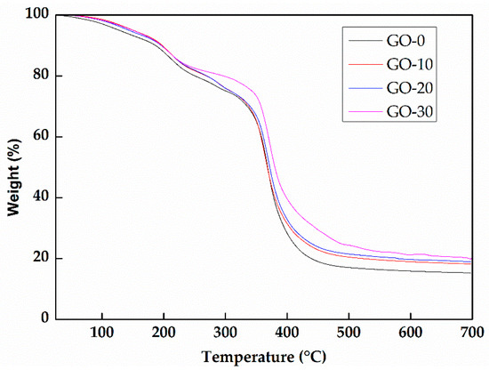 Figure 3 illustrates the thermogravimetric analysis (TGA) curves of the hydrogels with or without GO. As shown in the figure, there is no obvious difference among them and every curve has the same trend. When the temperature was elevated from room temperature to 700 °C, weight losses of the samples included four stages: 25−220 °C, 220−350 °C, 350−400 °C, 400−700 °C. The weight loss in the first stage was because of the evaporation of water and the degradation of small molecules. The weight loss at 220−400 °C was due to the degradation of the long-chain molecules such as xylan, polyacrylamide, and polyacrylic acid. Then, in the final stage, the weight of the hydrogels remained constant, which was attributed to the carbonation of the hydrogels. As seen in the figure, the hydrogels with higher content of GO had the higher weight in the end, which indicated that GO has a positive effect on the thermostability of hydrogels. The addition of GO also enhanced the intermolecular forces.