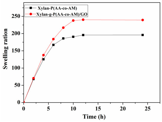 The swelling capacity of hydrogels is very important to their application. Figure 4 shows the swelling kinetics curve of hydrogels with or without GO. Swelling behavior of hydrogels is a process of dynamic equilibrium. Water molecules could easily diffuse into the hydrogel to expand its volume; besides, the expansion of the hydrogel makes the molecular chain of the network generate the elastic shrinkage. When these two opposite tendencies are opposed to each other, a dynamic equilibrium of swelling is reached. Clearly, the swelling rate of hydrogels increased rapidly in the initial stage. When the swelling time was 12 h, the swelling rate hardly changed. Therefore, the hydrogel reached the equilibrium state of swelling in the water after 12 h.