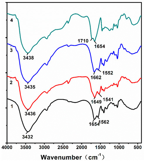 FTIR spectra of the (1) hydrogels, (2) hydrogels after adsorbing Pb2+, (3) hydrogels after adsorbing Cd2+, and (4) hydrogels after adsorbing Zn2+.