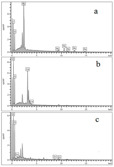 Energy dispersive X-ray (EDX) of the hydrogels after adsorbing the heavy metal ions (a) Pb2+, (b) Cd2+, and (c) Zn2+.
