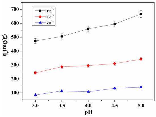 Figure 9 illustrates the influence of pH on the adsorption property of hydrogels. When the pH was 3.0, the adsorption capacity of hydrogels on Pb2+, Cd2+ and Zn2+ was low. With the increase of pH, the adsorption capacity of hydrogels on metal ions increased. This is due to the protonation of active functional groups in the hydrogel network at lower pH values, which hinders the interaction between adsorbents and heavy metal cations [1]. When the pH value is lower, the protonation of the amine group (–NH2) in the hydrogel was more obvious. There is electrostatic repulsion between –NH3+ and divalent metal ions (Pb2+, Cd2+, and Zn2+), which reduces the binding sites of metal ions that can be adsorbed, resulting in reduced adsorption capacity of the hydrogel. With the increase of pH value, the protonation of amines decreased gradually, and more amines chelated with metal ions, thereby the adsorption of hydrogel increased gradually [28]. In addition, the –COOH group in the hydrogel could be changed into –COO− in the range of high pH value, which generates electrostatic attraction with metal ions, and could also lead to the increase of adsorption capacity [29].