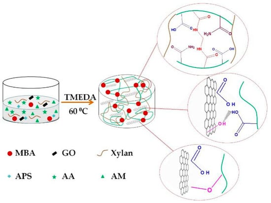The preparation process of xylan-g-/P(AA-co-AM)/GO nanocomposite hydrogels.