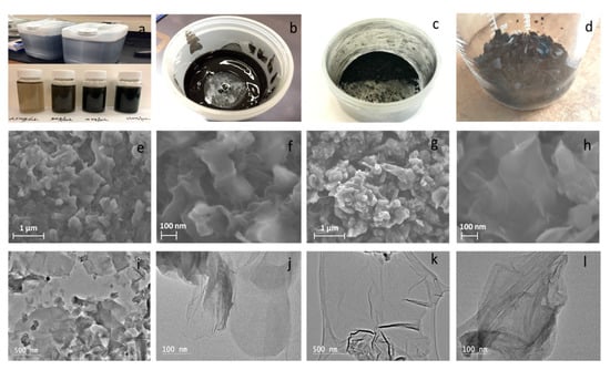 Synthesis of LGO aqueous solution, and solid nanoplatelets, and its morphology. (a) LGO aqueous solution. (b) LGO colloid. (c) LGO powders. (d) LGO slices. (e,f) SEM images of LGO aqueous solution. (g,h) SEM images of LGO nanoplatelets. (i,j) TEM images of LGO aqueous solution. (k,l) TEM images of LGO nanoplatelets.
