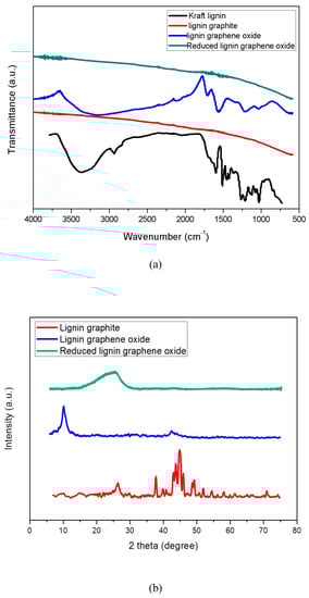 Graphene is an exciting material that has a one-atom-thick 1D planar sheet of sp2-bonded carbon atoms in a honeycomb crystal lattice structure displaying excellent electrical and mechanical properties []. In recent decades, graphene materials attracted significant attention due to their potential applications in transistors, conductors, batteries, catalysts, and biosensors [,,,,]. Nowadays, graphene can be produced by mechanical exfoliation, epitaxial growth and chemical vapor deposition []. However, it has been difficult to scale up production for high volume applications due to low yields and high costs. Recently, researchers developed a new method of converting Kraft lignin to graphene-based materials by catalytic graphitization []. The effects of temperature, catalysts, particle size, material properties and material characteristics have been extensively analyzed. These experiments demonstrated that high-quality nano-size multi-layer bio-graphene materials, with similar properties to current graphene products, can be successfully produced by a low cost thermal conversion process. Moreover, this method can be efficiently scaled up to produce large amounts of graphene material with high yields from byproduct lignin raw materials. However, this derived-graphene is strongly hydrophobic and highly stable which may not facilitate the assembly of macroscopic structures by simple solution processes []. Graphene oxide (GO), generally produced using natural graphite with cost-effective chemical methods, has some important characteristics []. This material, with hydrophilic groups, can be modified and reacted with other materials or additives to assemble graphene-based composites for many applications by a simple solution process. As a result, both GO and reduced graphene oxide are hot research topics in recent years.