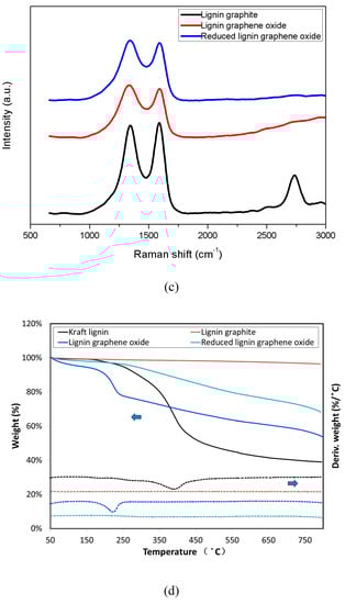 In Figure 3d, thermogravimetric analysis (TGA) was performed on Kraft lignin, LG, LGO, and RLGO respectively. The result for Kraft lignin shows that the solids yield of Kraft lignin sample decreased from 98.5% to 51.2% as the temperature increased from 100 to 400 °C. The yield of Kraft lignin samples stayed around 40.1% as the temperature increased to 800 °C. The major Kraft lignin weight loss of 40.4% occurred as the temperature increased from 250 to 450 °C, and because of its thermal decomposition, the maximum weight loss is attained at 395 °C, shown in derivative thermogravimetric curve. The LG sample exhibits a high yield without noticeable degradation as the temperature increased to 800 °C, because the LG sample was well graphitized through the catalytic graphitization process, and only around 3.0% weight is lost from the LG sample as temperature increased to 800 °C in Figure 3d. The TGA curve of the LGO sample shows obvious mass loss below 200 °C, presumably attributed to the CO and CO2 streaming from the most labile functional group. The result of LGO exhibits another mass loss (28%) in the range of 220 to 800 °C, which has been attributed to the loss of oxygen functional groups. In contrast, the TGA result of the RLGO sample shows higher thermal stability than the LGO sample. The total loss is 27% at temperatures below 800 °C. This lower mass-loss can be attributed to the absence of most oxygen functional groups [].
