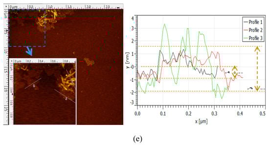 Figure 3e shows the morphology and thickness of LGO samples by AFM. Figure 3e shows that LGO samples typically had flake-like and tube-like structures with less than 1 μm lateral size and the range of thickness of LGO samples was between 1 to 3 nm. The layer-to-layer distance (d-spacing) of graphene oxide is 0.850 nm [], which indicated that this LGO sample typically has 1 to 3 layers. The lateral size of LGO was typically less than 1 μm, which was less than that of graphene oxide made from natural graphene. The sonication can exfoliate the LGO to fewer layers. The nanoscaled LGO may apply for conductive materials [].
