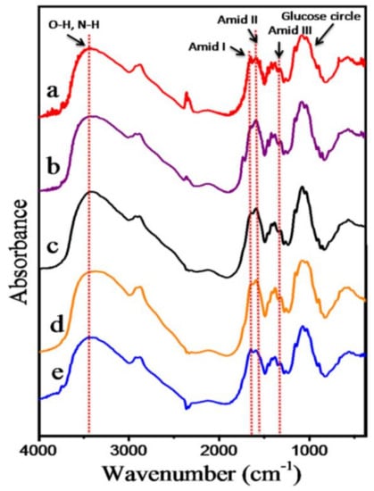 FTIR spectra of the initial chitosan (CTS0, Mw = 94.28 kDa) (a), chitosan obtained through the heterogeneous degradation of chitosan by H2O2 (CTS1, Mw = 48.35 kDa) (b), OCS1 (Mw = 5.48 kDa) (c), OCS2 (Mw = 4.21 kDa) (d), and OCS3 (Mw = 3.60 kDa) (e).