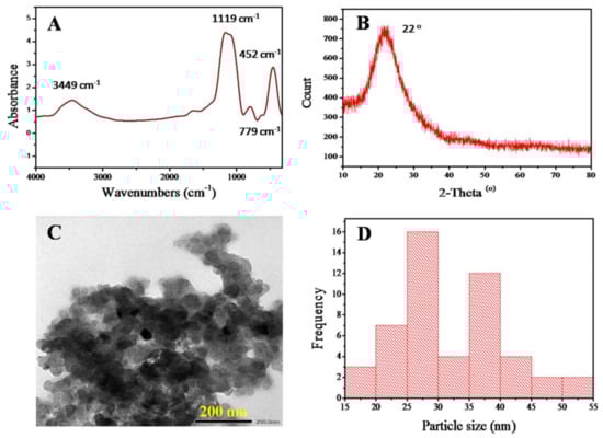 After the incineration process of acid-treated RHs at 700 °C, the obtained nSiO2 was analyzed by FTIR, XRD, and TEM. Figure 2A shows that characteristic peaks appear at 1119 cm−1 (the asymmetrical stretching vibration of O–Si–O), 779 cm−1 (the symmetrical stretching vibration of O–Si–O), and 452 cm−1 (the bending vibration of O–Si–O) []. The band at 1179–1200 cm−1 is attributed to the asymmetric stretching mode of the SiO4 coordination units; the broad peak at 3449 cm−1 is assigned to stretching of the –OH groups, while a small and low peak that appeared at 1639 cm−1 is related to the bending vibration of water molecules absorbed onto the surface of the silica particles [,].