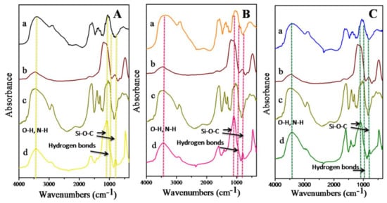 In comparison with the FTIR spectra of nSiO2 and OCS, Figure 3A(d),B(d),C(d) show that the FTIR spectra of the hybrid materials possess the characteristic absorption peaks of both OCS and nSiO2. However, the bands of the O–H and N–H stretching vibrations of OCS at 3400 cm−1 are narrower and shifted to higher wavenumbers in the FTIR spectra of the hybrid materials than in the OCS spectrum due to the interactions of OCS with nSiO2. New bands appear at 1083 cm−1 and 799 cm−1 (the vibrations of the newly created Si–O–C bond) in the FTIR spectrum of the OCS1/nSiO2 hybrid material. Additionally, a shoulder peak at 971 cm−1 can be assigned to the formation of hydrogen bonds between the silanol groups on the surface of silica and the amid and oxy groups of OCS/CMC [], while the amide I band of OCS1 at 1642 cm−1 shifts to 1622 cm−1 and the position of the amide II peak at 1589 cm−1 also relocates to 1598 cm−1 in the FTIR spectrum of OCS1/nSiO2, which indicates the appearance of associations between OCS and CMC. Moreover, a weak shoulder peak at 1735 cm−1 reflects the interactions between the –COOH groups of CMC and the –NH2 groups of OCS [].
