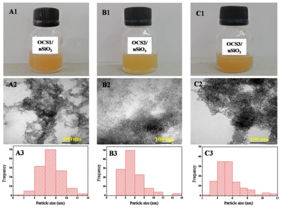Photographs of the hybrid materials, TEM micrographs, and diagrams of particle size distributions for OCS1/nSiO2 (A(1), A(2), and A(3)), OCS2/nSiO2 (B(1), B(2), and B(3)), and OCS3/nSiO2 (C(1), C(2), and C(3)), respectively.