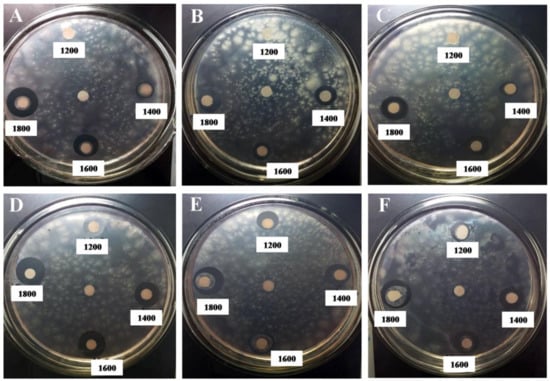 The antifungal activities of chitosan, oligochitosan, silica, and the hybrid materials were investigated via a paper disk-diffusion method. First, carrot glucose agar plates (CGA, carrot infusion 220 g L−1, glucose 20 g L−1, agar 9 g L−1) were prepared as described in a previous report [] with several modifications. Second, cell suspensions obtained from fungal colonies were spread directly on the agar surface. Then, paper discs (diameter 6 mm) loaded with a volume (50 µL) of the antimicrobial agents at different concentrations (600, 800, 1000, 1200, 1400, 1600, and 1800 mg L−1) in distilled water were dried in air and placed on the inoculated agar plates and incubated for two days. The inhibition zones were calculated from their diameters. The statistics were analyzed by using two-way analysis of variance (ANOVA) with p-values less than 0.05 being considered statistically significant.