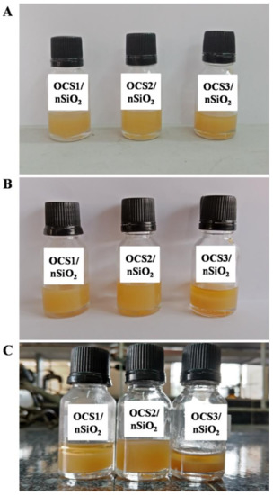 Images of OCS1/nSiO2, OCS2/nSiO2, and OCS3/nSiO2 after 1 day (A), 15 days (B), and 30 days (C).