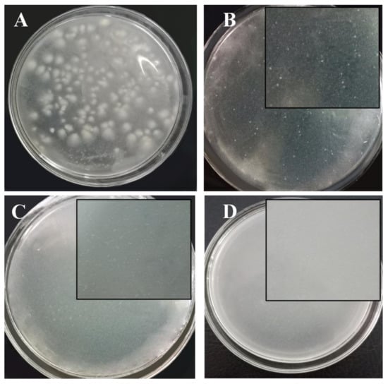 The images of the control agar plate (A) and agar plates with OCS2/nSiO2 solutions at concentrations of 400 mg L−1 (B), 600 mg L−1 (C), and 800 mg L−1 (D).