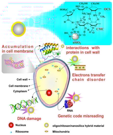 In this study, the possible antifungal mechanisms of OCS-nSiO2/CMC hybrid materials are described (Figure 8). These materials may possess synergistic characteristics of both components, nSiO2 and OCS, as mentioned above. nSiO2 with tiny size coated by OCS/CMC with active functional groups probably easily deactivate protein molecules in the cell wall and accumulate in the cell membrane, leading to cell lysis. Moreover, the normal physiological functions of a fungal pathogen can be directly disrupted via DNA damage, genetic code misreading, as well as electron transfer chain disorders by the OCS-nSiO2 hybrid material, when it penetrates inside the fungal pathogen.