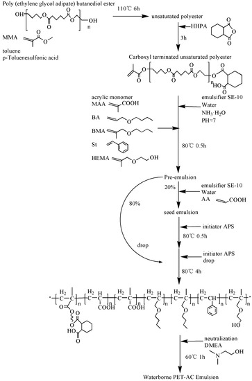 Synthetic route of waterborne PET-AC emulsion.