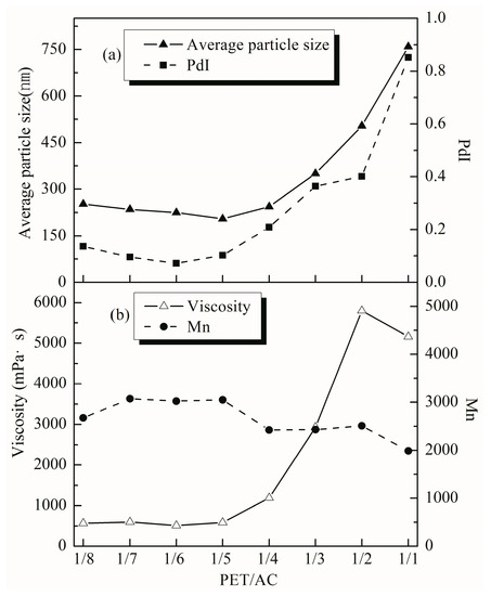 Effect of the PET/AC ratio on the properties of the emulsion. (a) Average particle size and PdI; (b) viscosity and Mn. Conditions: The amount of HEMA was 30% of total weight of the PET and acrylate monomers, the ratio of AA/MAA/BA/St was 1.2/2.6/10.9/24.5 in this series reaction.
