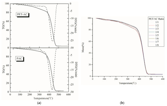(a) TGA/DTGA curves of PET-AC and PAC; (b) Thermogravimetric analysis of different ratios of PET/AC.