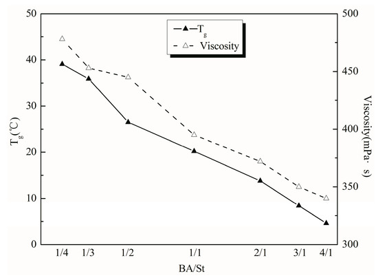 As can be seen from Figure 5, the viscosity of the emulsion increased as the content of the hard monomer St increased. When the proportion of BA was less than St, the hard monomer accounted for a larger component. There were many active side groups on the molecular chain of resin, and the molecular chain was hindered by steric hindrance, which made it difficult to move. This increased more hydrogen bonds among the molecules, which led to a higher viscosity of emulsion. When there is more BA in the system and St is less, the soft monomer accounts for larger components, and the molecular chain is more flexible. The steric hindrance of the movement was smaller, the polymer chain was curled, and the viscosity was lowered. The Tg of the polymer decreased as the soft monomer BA content increased. When the Tg was too low, the emulsion would become sticky after film formation, and when the Tg was too high, the emulsion would become hard and brittle after film formation, which resulted in poor flexibility [26]. Considering the factors above, the suitable soft/hard monomer ratio was 1/3.