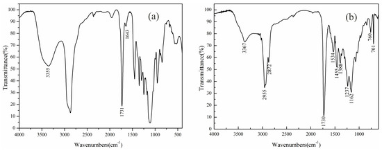 FTIR spectra of (a) PET and (b) PET-AC emulsion.