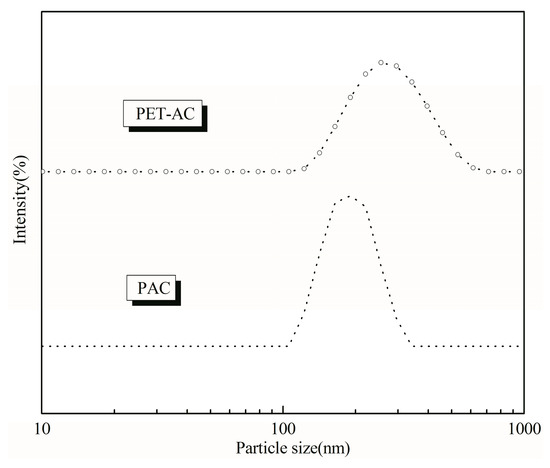 According to Table 3, the solid content of emulsion after polyester modification was slightly higher than the pure PAC. From Figure 8, the PET/AC emulsion had a larger average particle size and wider distribution than PAC emulsion. As can be seen from Figure 9, the particle size of PET-AC latex particles was obviously larger than that of PAC, and the arrangement was more compact. According to the mathematical model of random compact accumulation of spherical objects [30,31], the wider the size distribution, the greater the packing density. Therefore, the solid content of PET/AC emulsion was higher than PAC emulsion [32,33]. The viscosity of PET/AC was greater than PAC, which made it better in sag resistance.