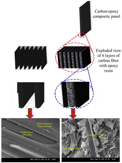 There is no doubt that composites are a class of materials receiving much attention world-wide as an alternative for various existing structural and lightweight, high strength materials. The synergistic properties of their components make them superior in numerous applications due to advantages, such as high specific strength and modulus, facile fabrication, high design flexibility, good resistance to fatigue and corrosion, desirable thermal expansion characteristics, and economic efficiency [40,41,42]. These properties can further be tailored to suit certain intended functions via control over the composition and fabrication of the composite. One such method is the interleaving of nanofibrous mats, which are prepared via various techniques, like drawing, electrospinning, self-assembly, template synthesis, and thermal-induced phase separation [43]. Figure 1 schematically shows a laminated composite with and without interleaved nanofibers [42], while the Field Emission Scanning Electron Microscope (FESEM) images present the effect of an incorporation of the nanofibers on the failure surface roughness of the composites [41]. It can be seen that after incorporation of the nanofibers, the brittle failure of the composite’s interlayer has transitioned to tough failure.