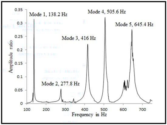 The NF values and DF values were obtained for the first five modes. The change in NF for three, five, and eight-layer nanocomposite laminates was observed in all the modes due to the presence of nano clay up to 5% by weight in all the modes. The frequency response function (FRF) plot for the nanocomposite specimen with 3% clay is shown in Figure 2. The change in NF for all the modes was more than 10% higher when compared to the neat epoxy specimen. The change in mode 1 NF was 11.4% higher when compared to the neat epoxy specimen. The change in NF of the three-layer laminate with 5% clay was 17.7% higher than the neat epoxy specimen in modes 1 to 5. The DF value of the specimen with 3% clay was higher than the other specimens. The authors observed the same trend in all the modes of three, five, and eight-layer laminates. The enhancement of the DF for the three-layer laminate with 3% clay was 73% higher than the neat epoxy specimen in mode 1. The NF values in mode 1 for the impacted laminates were about 10% less than that in un-impacted laminates, which was due to the damage caused by the impact loading.