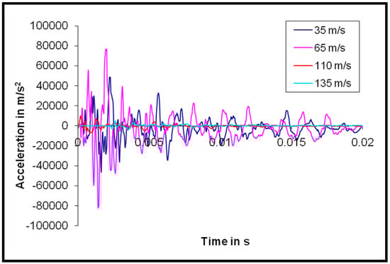 They observed that the maximum amplitude of acceleration for impact velocities that are below the ballistic velocity was 10 times higher than that for velocities that are above the ballistic limit. In this particular case, for specimens with 3% filler, the maximum amplitude of acceleration when subjected to an impact velocity of 35 m/s was 48,522 m/s2. The maximum amplitude of acceleration of the specimen with the same configuration when subjected to an impact velocity of 135 m/s was 4892 m/s2.