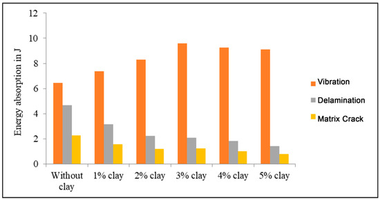The authors presented that the kinetic energy of the projectile is absorbed by the specimens in the form of deformation under strain and then vibration, failure due to delamination, and matrix cracking. It was also observed that the energy absorbed by the laminate in vibration is the energy absorption in vibration for impact velocities that are below the ballistic limit, but higher than the energy absorbed due to delamination and matrix cracking. The presence of clay in the matrix enhanced the interaction between the clay and polymer within the elastic limit, which reflects an increase in energy absorption due to vibration. It was observed that the specimen with 3% clay showed a higher increase in energy absorption during vibration when compared to the neat epoxy specimen, which is due to the exfoliated structure formation within the matrix.