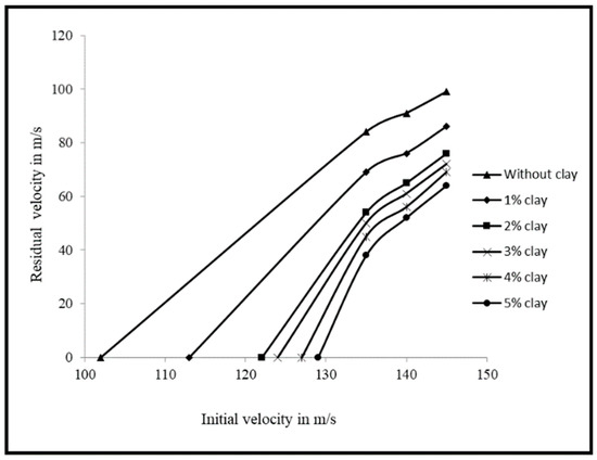 The authors conducted experiments for various initial velocities of the projectile and obtained residual velocities for each case of the initial velocity. The authors also considered various other impact studies [61,62,63] and the results of the initial projectile velocity and projectile velocity after penetration of the three-layer specimens with clay and without clay are shown in Figure 5. It was observed that the specimen without clay was perforated at 101.84 m/s and the specimen with 2% clay was perforated at 122.32 m/s, and the enhancement of the velocity was about 20%. The specimen with 3% clay showed an enhancement of 22% when compared to the specimen without clay. The specimen with 5% clay was perforated at 129.51 m/s, where the enhancement of the velocity was about 27%. It was observed that the enhancement of the ballistic velocity was better for a specimen with clay up to 2%, and thereafter, the enhancement was only marginal. The specimens were tested for the above ballistic impact velocities of 135 m/s, 140 m/s, and 145 m/s. In all the cases, the specimen without clay showed higher residual velocities than the specimen with 1%–5% clay. The decrease in the residual velocity was high for the specimen with 5% clay when compared to the specimen without clay. It means that the specimen with 5% clay has a higher impact resistance capacity. The decrease in the percentage of the residual velocity for specimens with 2%, 3%, 4%, and 5% clay when subjected to an impact velocity of 135 m/s was 35%, 40%, 46%, and 55%, respectively, when compared to specimens without clay. Clay dispersion up to 2% offered high resistance to perforation. This can be observed through the change in the slope shown in Figure 5. When the specimens were subjected to a velocity of 140 m/s, the decrease in the percentage for the specimens with 2%, 3%, 4%, and 5% clay was 29%, 33%, 38%, and 43%, respectively. For the corresponding values for a velocity of 145 m/s, the decrease in the percentage of the residual velocities was 23%, 27%, 30%, and 35%, respectively.