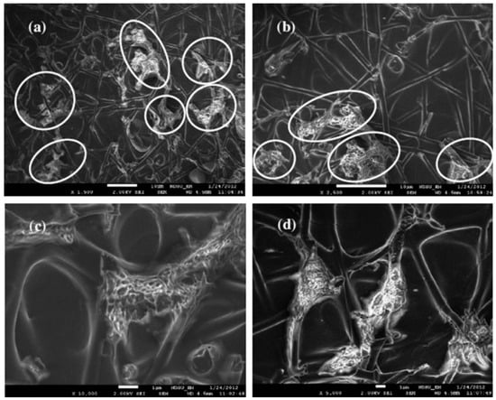 SEM images of the fracture surfaces of the self-healing carbon/epoxy composite containing core-shell nanofibers after a three-point bending test. (a,b) Core-shell nanofibers in the resin rich layer (circled spots showed the released DCPD damage and solidification). (c,d) Solidification of DCPD after encountering the catalyst. Reprinted with permission from [66].