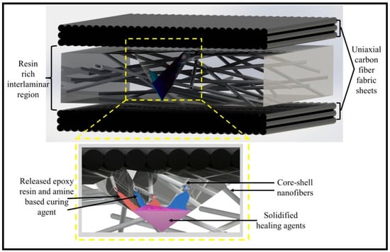 The concept of the self-healing process in laminated composites using core-shell nanofibers. Reprinted with permission from [69].